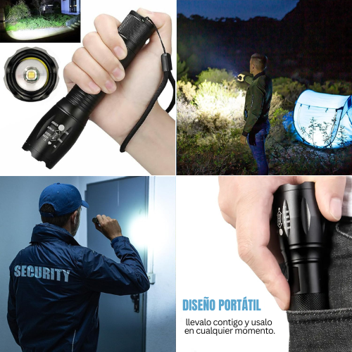 Fabricada en aluminio de alta calidad, esta linterna de grado militar es resistente al agua, duradera y lista para acompañarte en cualquier aventura.