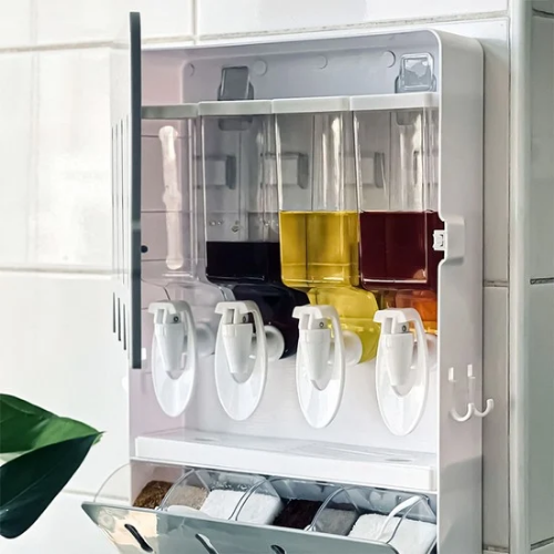 ¡Simplifica tu cocina con nuestro innovador dispensador de condimentos! Diseñado para ofrecerte una solución práctica y elegante, este dispensador cuenta con cuatro compartimentos transparentes que te permiten almacenar y acceder fácilmente a tus salsas, aceites y especias favoritas.