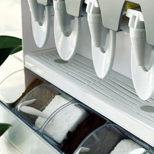 Almacenamiento Eficiente: Incluye compartimentos adicionales para azúcares y otros condimentos, manteniéndolos organizados y al alcance.
